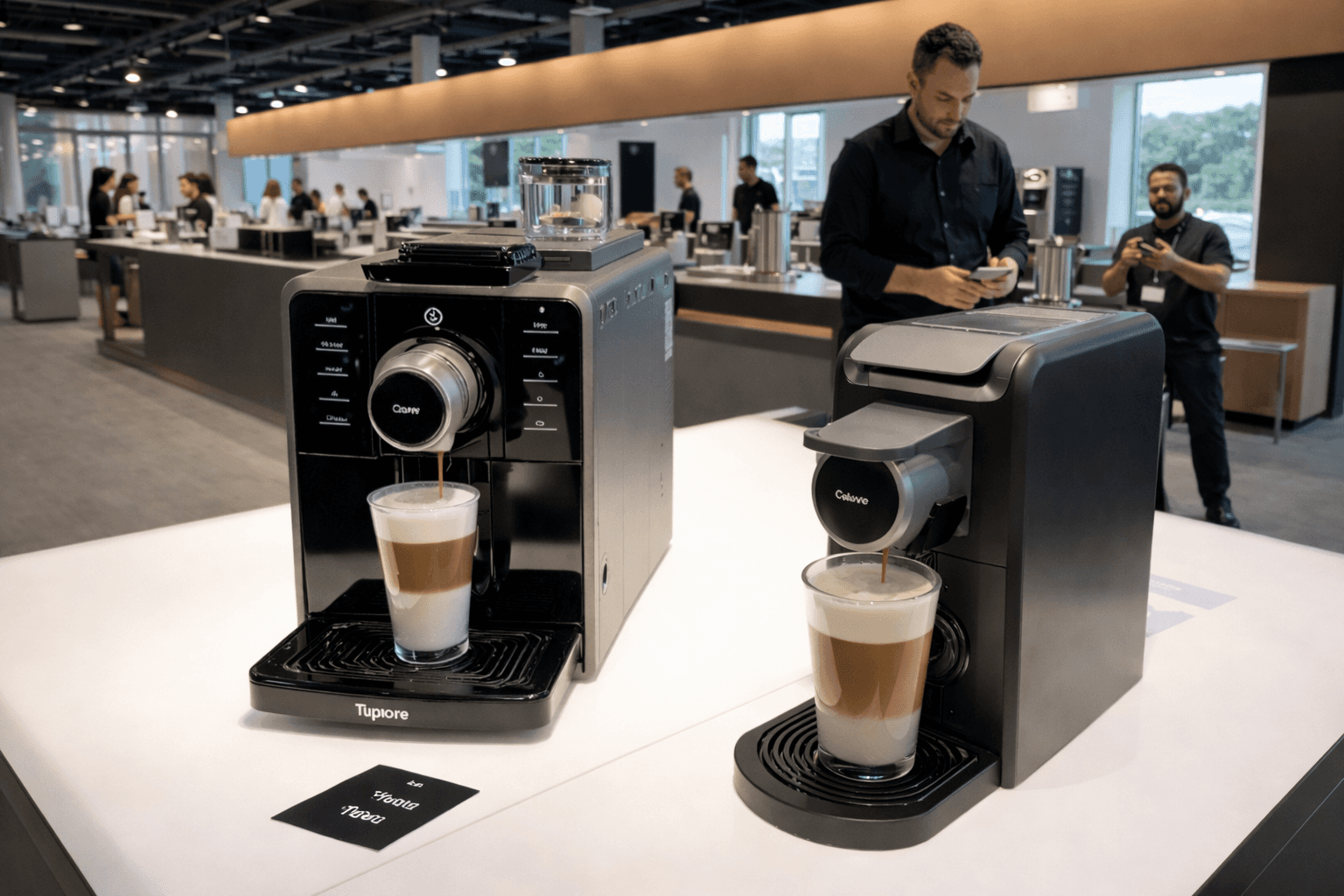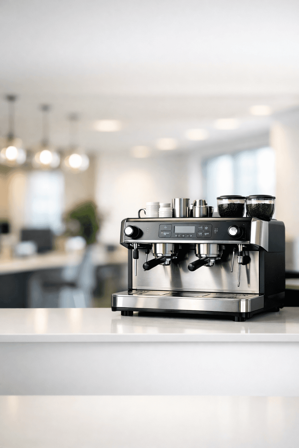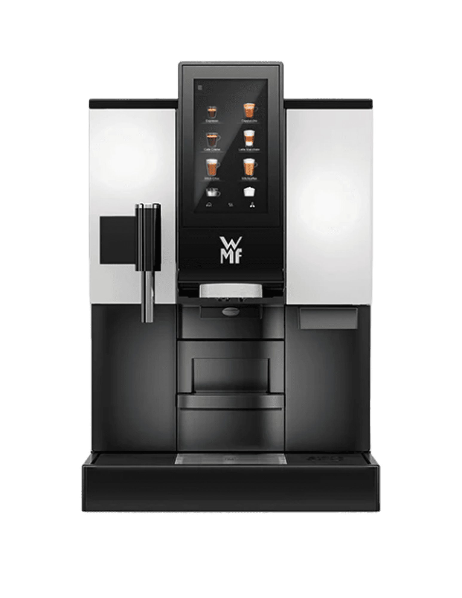 Compact super-automatic with built-in milk carafe. Lattes, cappuccinos, and espresso from a tank-fed machine. Entry point for small teams that want automatic milk drinks.