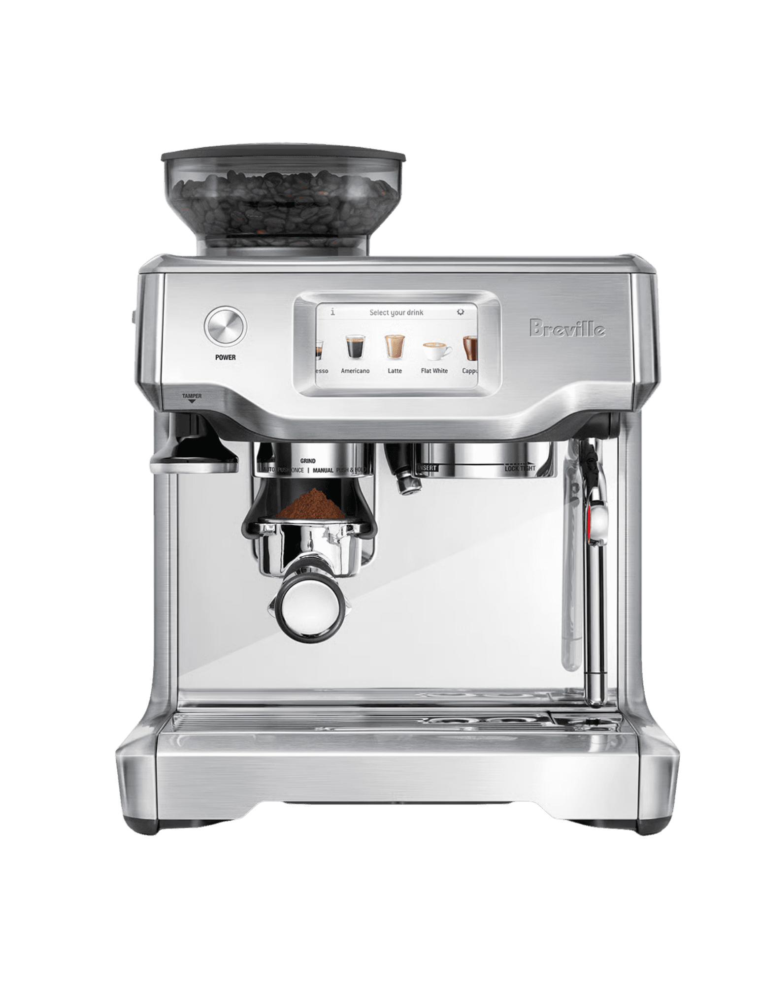 Prosumer espresso with built-in grinder and touchscreen. 2-step brew that serves great espresso in under 2 minutes.